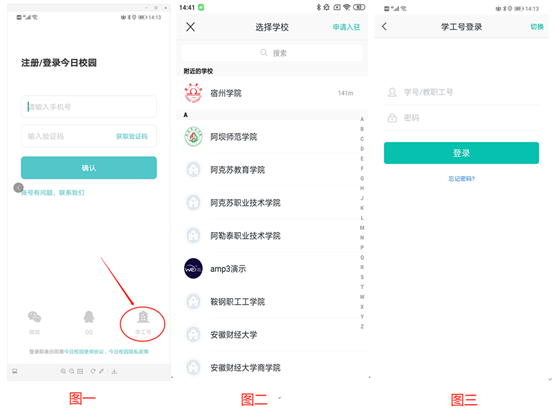 2.在APP登录界面选择右下角的“学工号”(图一),选择学校“宿州学院”(图二),输入教职工号(没有工号的职工此处输入手机号码)(图三),初始密码为6个1,登录后更改密码,绑定手机号,完成APP登录。