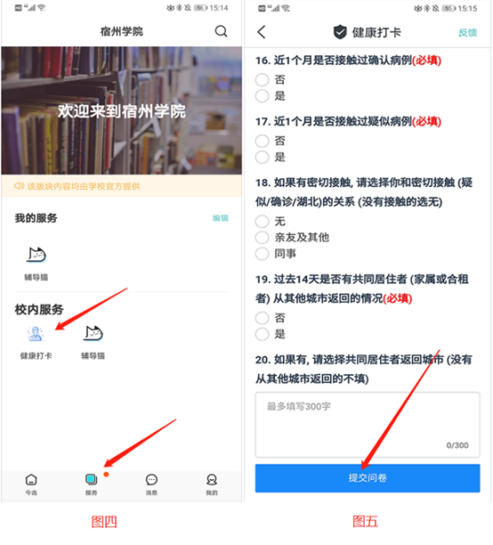 选择“今日校园”APP界面里的“服务”(图四),进入“健康打卡”界面,填写完成并点“提交问卷”(图五),完成信息上报。